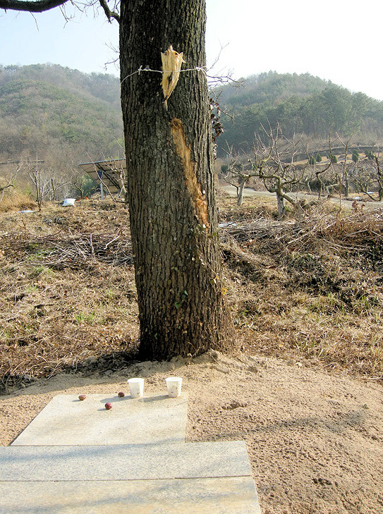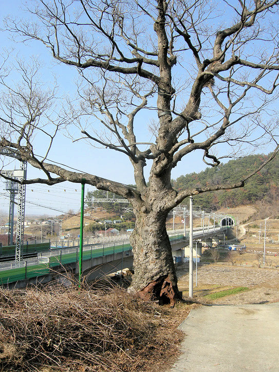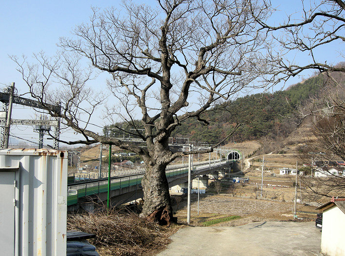 경전선 철도가 당곡마을 바로 옆을 달리고 있습니다. 여기 경사면에는 두 그루의 오래된 거대한 느티나무가 있습니다. 집과 함께 있습니다.